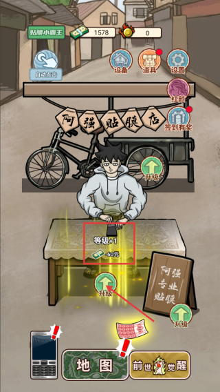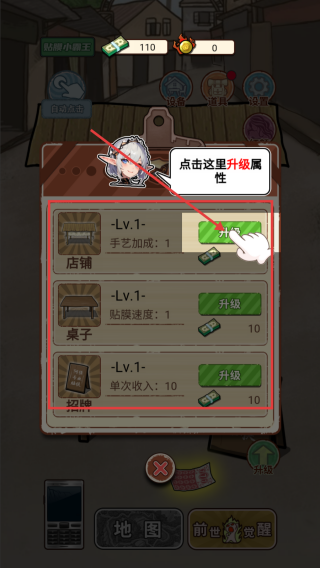 2、积累一定收入后,点击“升级”,优先提升“手艺加成”“贴膜速度”“单次收入”等属性,提高贴膜效率和收益。