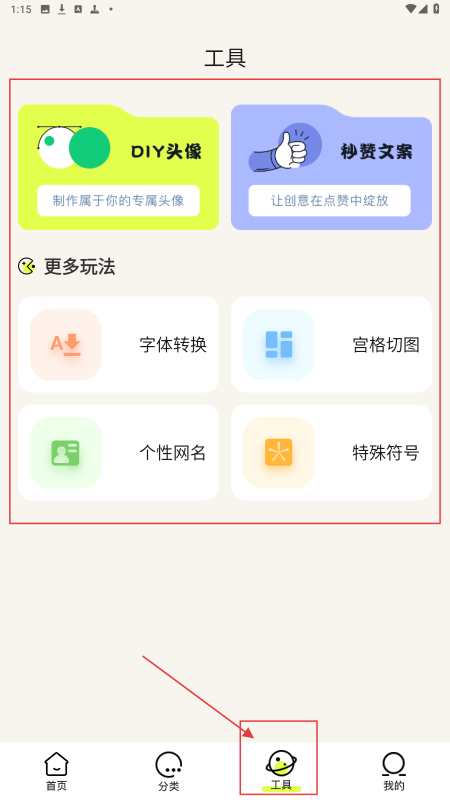 1、进入应用【工具】页,有【DIY头像】【秒赞文案】功能,及【字体转换】等“更多玩法”。