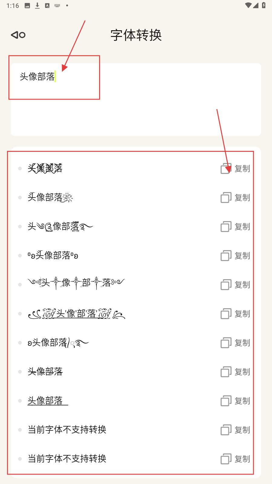2、在【字体转换】页,输入文字,生成多种艺术字体,点击【复制】获取转换后文字,用于个性签名、网名等场景。