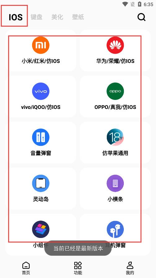 1、进入应用【功能】页,选【IOS】分类,有“小米/红米/仿iOS”等机型适配、“灵动岛”等功能,点击安装对应仿iOS模块。