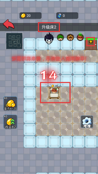 3、开局快速进入房间躺床,积累金币后优先升级床增加收益。利用金币建造炮台等防御设施,抵御怪物攻击,不断升级建筑和设施。