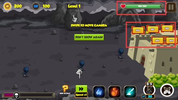1、游戏开始,留意界面上方金币、经验值和生命值。通过提示,滑动屏幕移动视角,观察战场,点击城堡上“ADD”按钮花费金币建造防御塔。