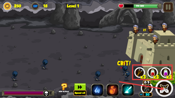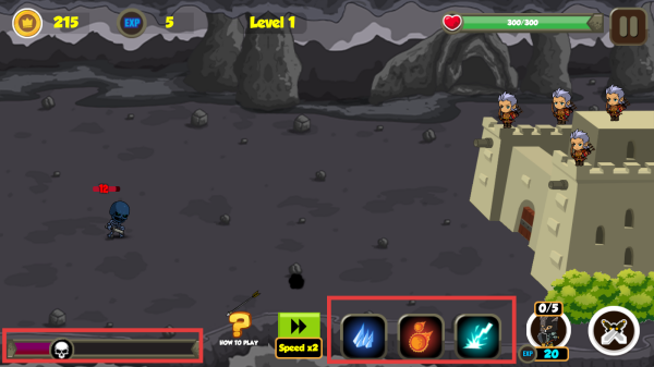 3、利用底部技能按钮,在怪物密集时释放技能攻击。适时点击加速按钮加快游戏进程。通过消灭怪物获取金币和经验值。