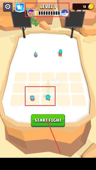 1、进入游戏,在战斗界面观察关卡信息(如LEVEL1)和金币数量。点击“STARTFIGHT”开始战斗,操控角色移动、攻击,击败对手。