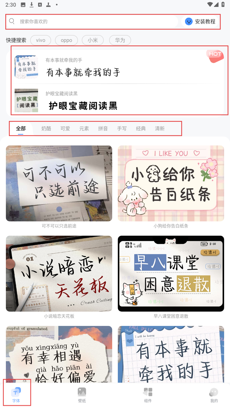 1、进入【字体】页,用搜索栏找字体,选“有本事就牵我的手”等热门字体,按分类(奶酪、可爱等)筛选,点击预览/应用。