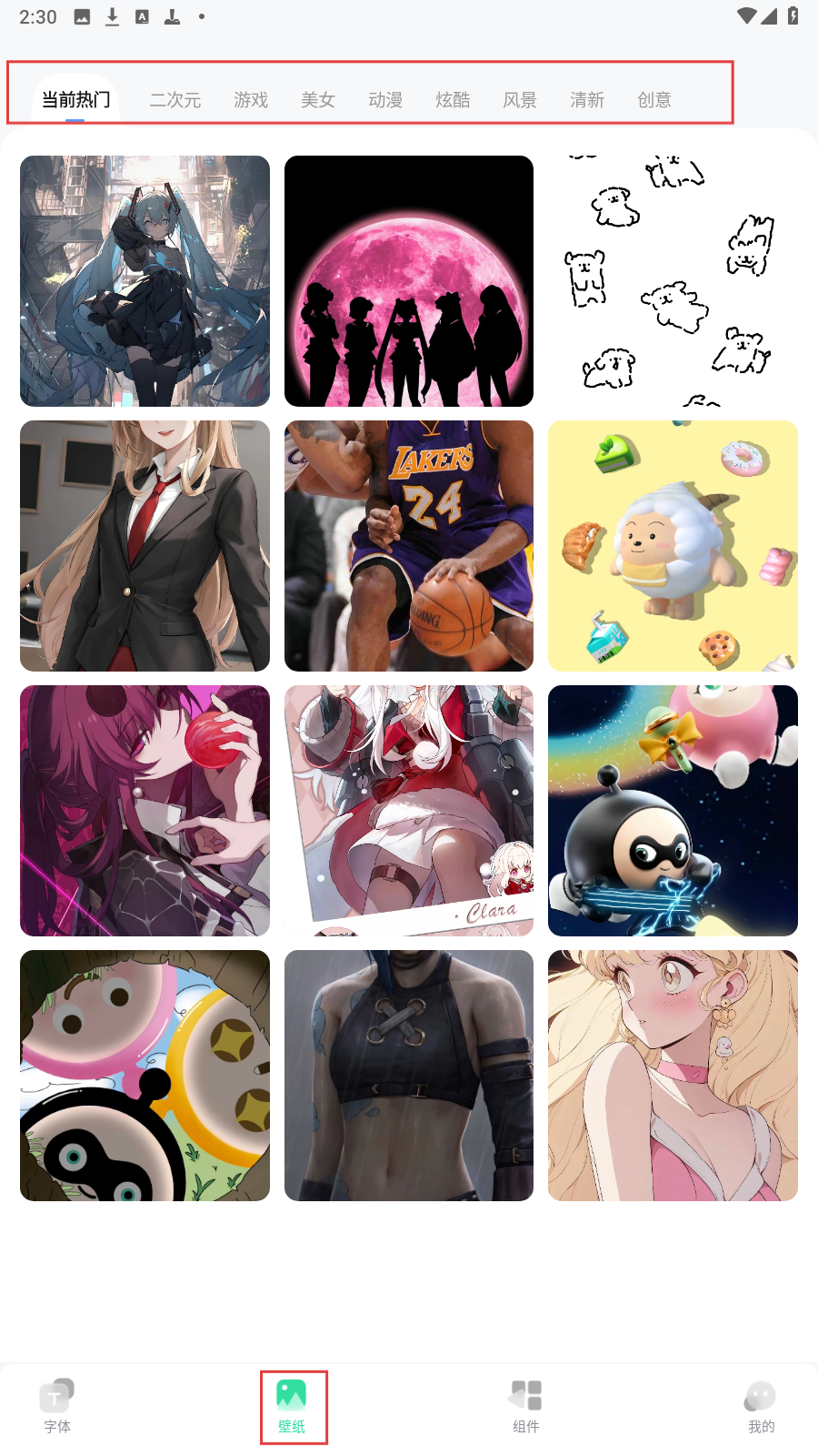 2、切换到【壁纸】页,按分类(当前热门、二次元等)选壁纸(如动漫人物、科比主题),点击预览,准备设置。