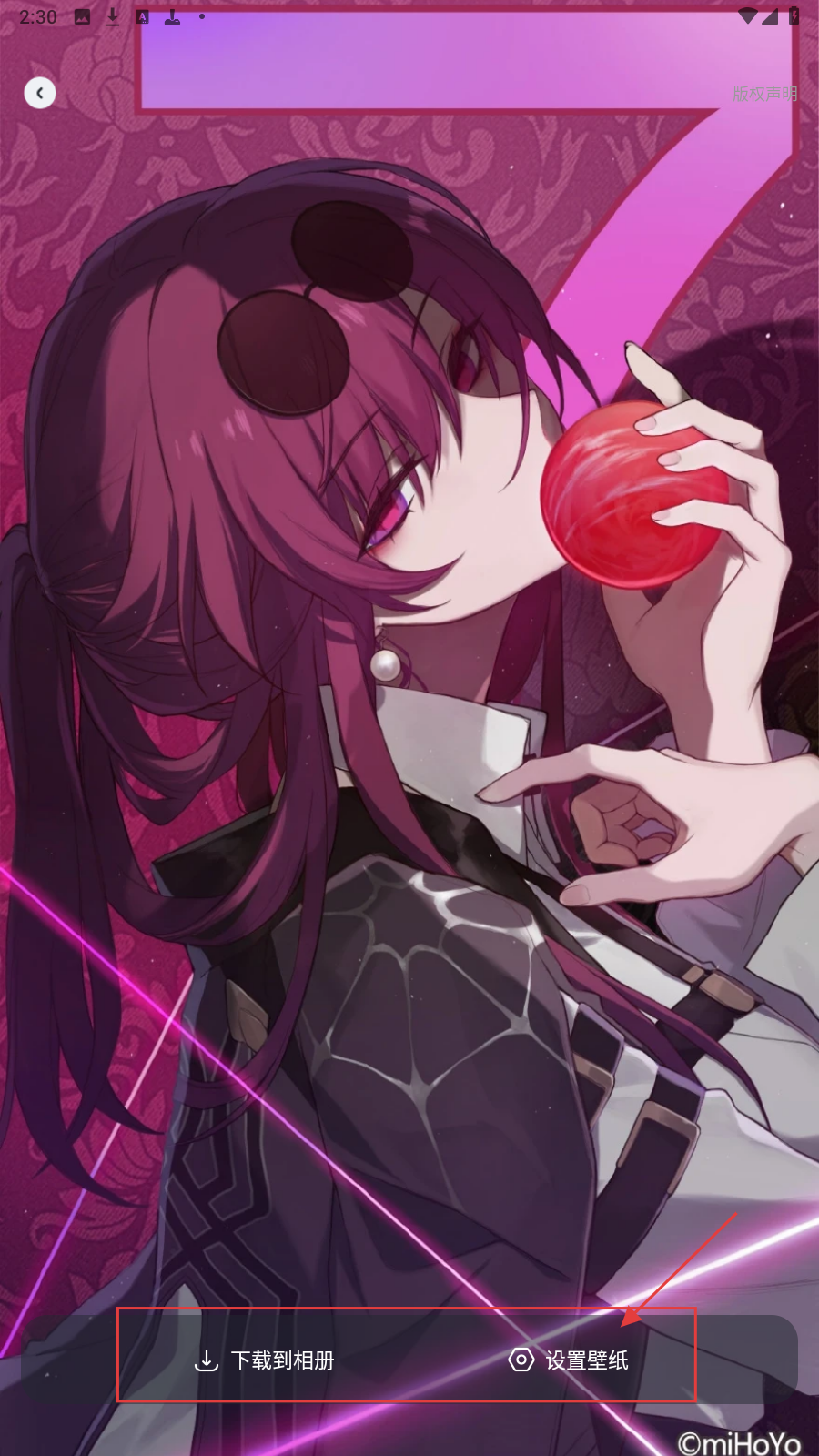 3、打开壁纸详情页(动漫风格,含“下载到相册”“设置壁纸”),点击【设置壁纸】设为桌面/锁屏,或【下载到相册】保存,完成美化操作。