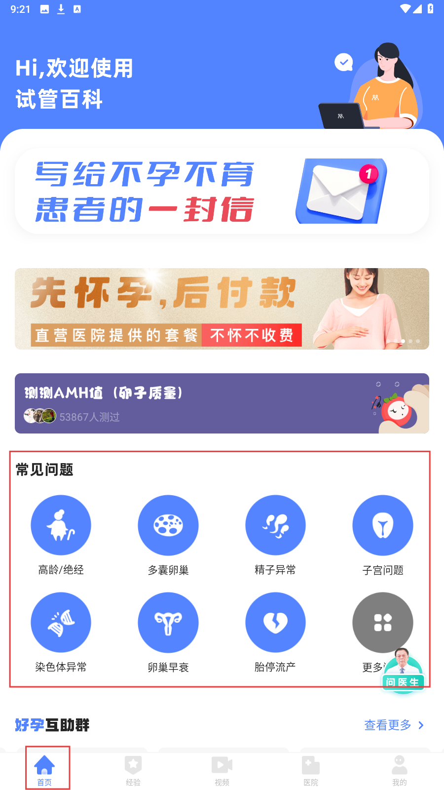 1、进入【首页】,有“先怀孕,后付款”套餐、测AMH值入口,及“高龄/绝经”等常见问题分类,点击对应模块获取信息。