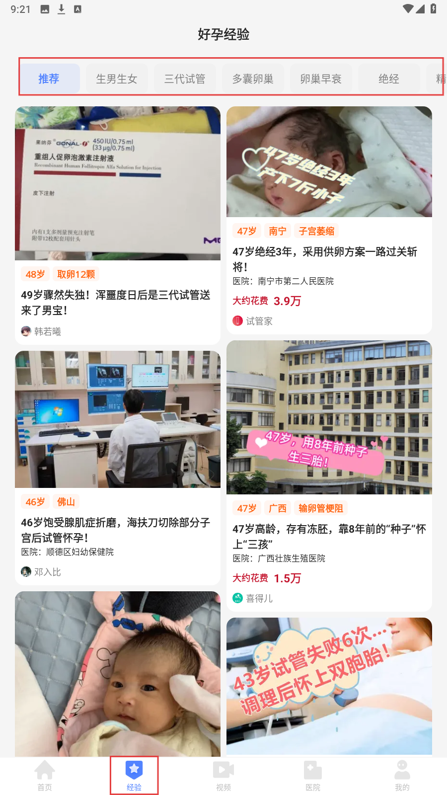 2、切换到【经验】页,选“生男生女”“三代试管”等分类,浏览好孕案例,参考试管经历、花费。