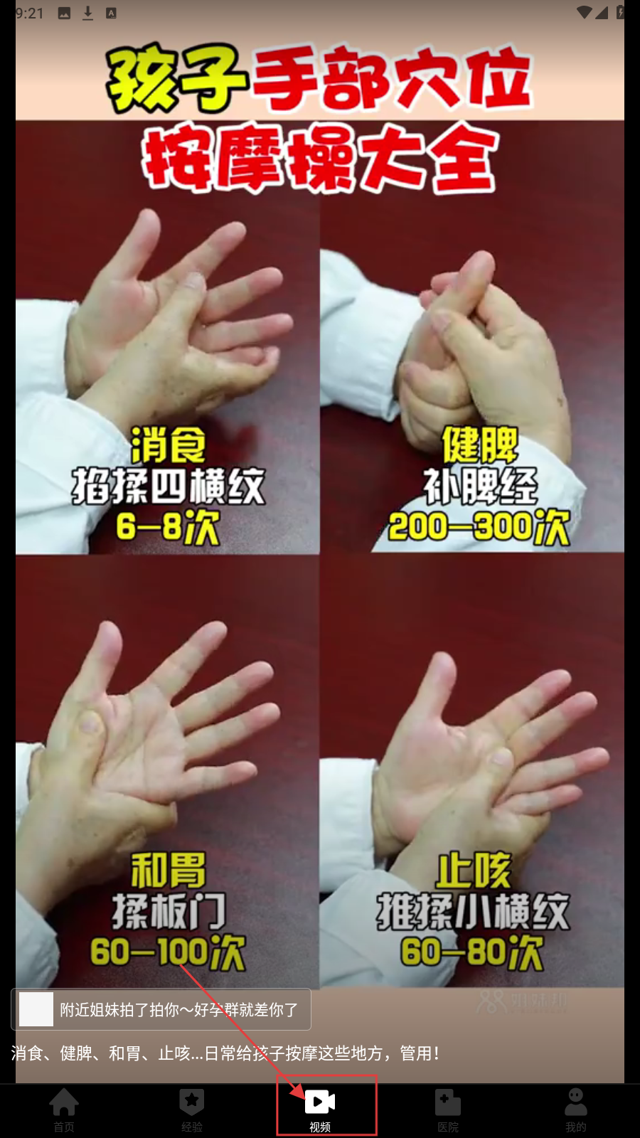3、打开【视频】页,查看“孩子手部穴位按摩操大全”等内容,学习消食、健脾等按摩手法,底部切“医院”“我的”管理使用。