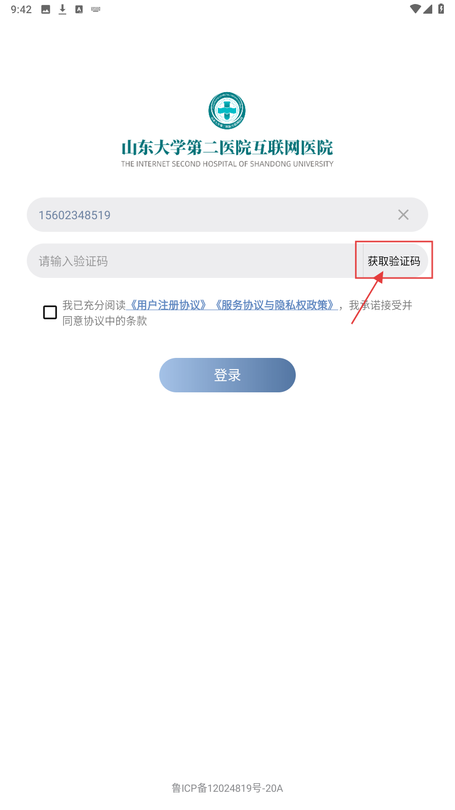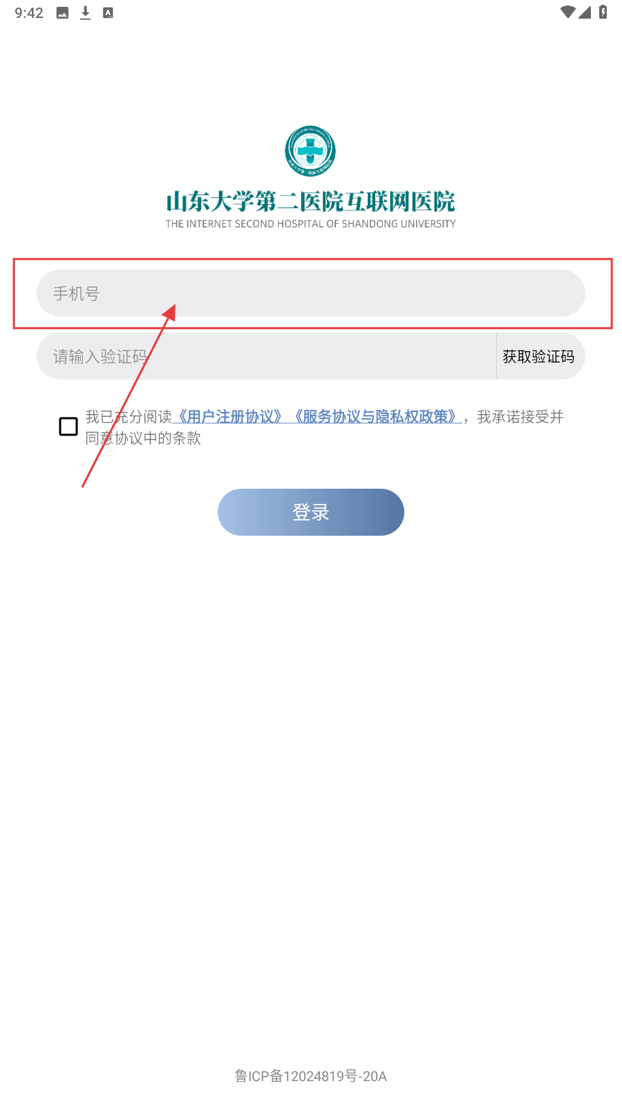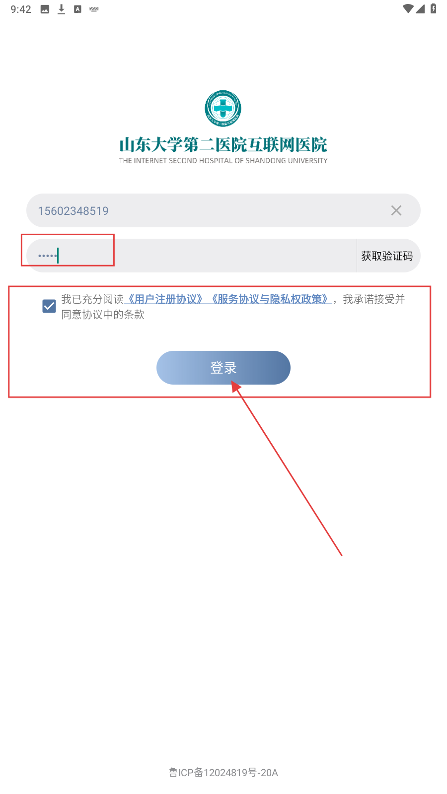 3、勾选“我已充分阅读…协议”,点击【登录】,完成医院互联网平台登录,进入诊疗服务。