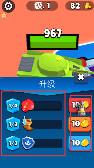 2、积累一定金币后,点击升级按钮,选择升级项目(如拳击手套、带翅膀靴子、盾牌等),花费10金币提升坦克能力,增强战斗实力。