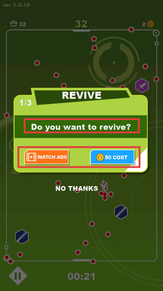 2、游戏中若失败,出现“REVIVE”复活提示界面,可选择“WATCHADS”看广告免费复活,或花费50金币复活,继续游戏。