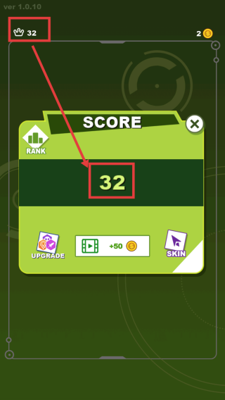 3、游戏结束后,查看“SCORE”得分界面,了解本局分数。可通过看广告获取+50金币奖励,利用金币进行升级或更换皮肤,提升游戏体验。