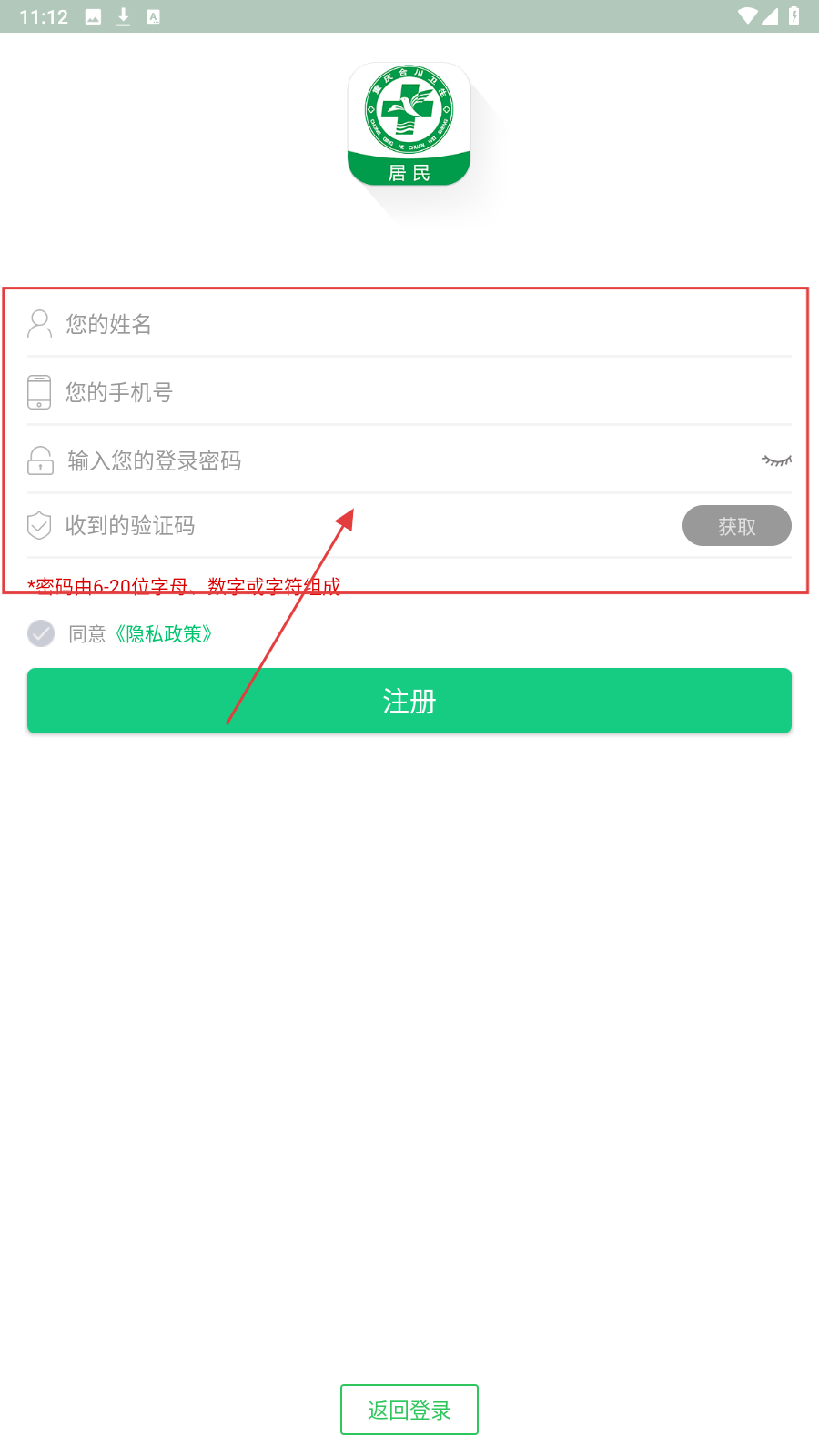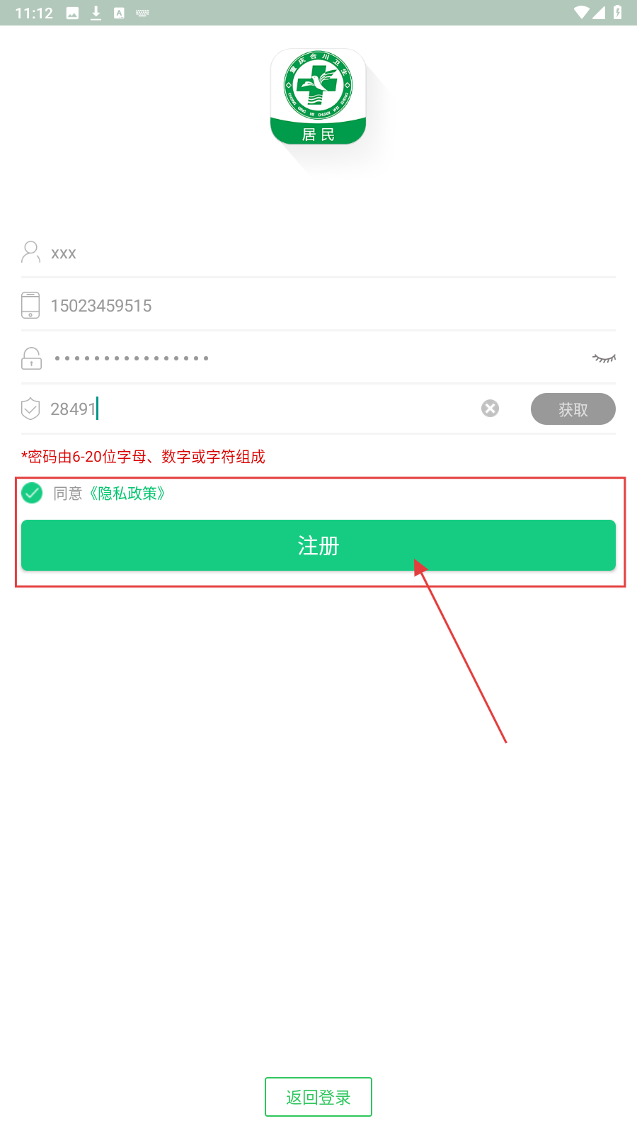 3、勾选同意《隐私政策》,点击【注册】,完成账号注册,后续可登录使用医疗服务。