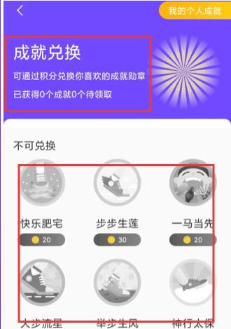 2、在【我的成就】页,“成就兑换”可积分换勋章(快乐肥宅20积分等),按需选未兑换勋章操作。