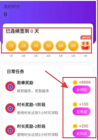 3、切换【我的积分】页,看连续签到、日常任务(勋章奖励等),点“去领取”“去完成”做任务赚积分。