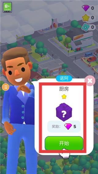 1、游戏开始,点击角色“诺阿”旁的“厨房”场景,进入关卡。留意界面上方的资源显示(紫色宝石、星星、相机图标)和进度条。