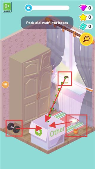 2、根据任务提示“Packoldstuffintoboxes”,在场景中找到旧物品,将其拖动到对应的箱子中。