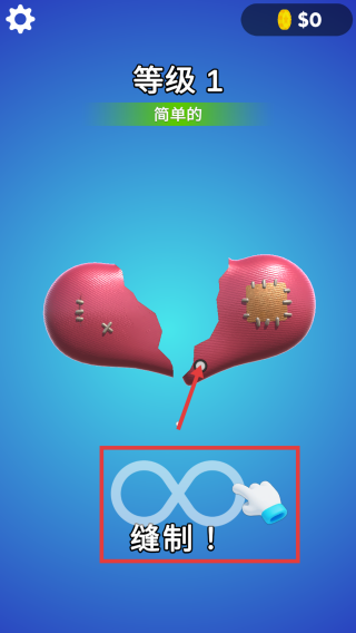 1、游戏开始,进入等级1关卡,根据“缝制!”提示,操控工具对破损的心形物品进行缝制修复。