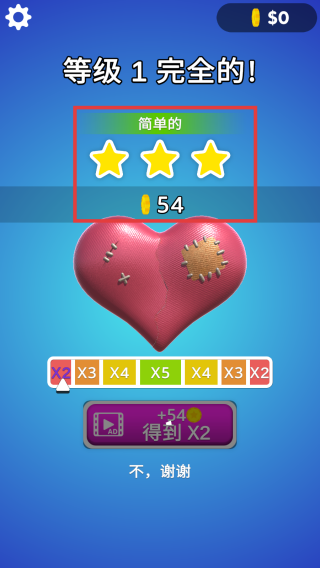 2、完成修复后,获取3星评价和54金币奖励。可通过看广告等方式使奖励翻倍,增加金币积累。