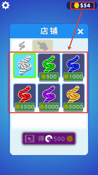 3、积累一定金币后,进入商店界面,根据金币数量选择购买不同颜色线团,用于后续关卡修复,提升游戏体验,持续挑战更高等级关卡。