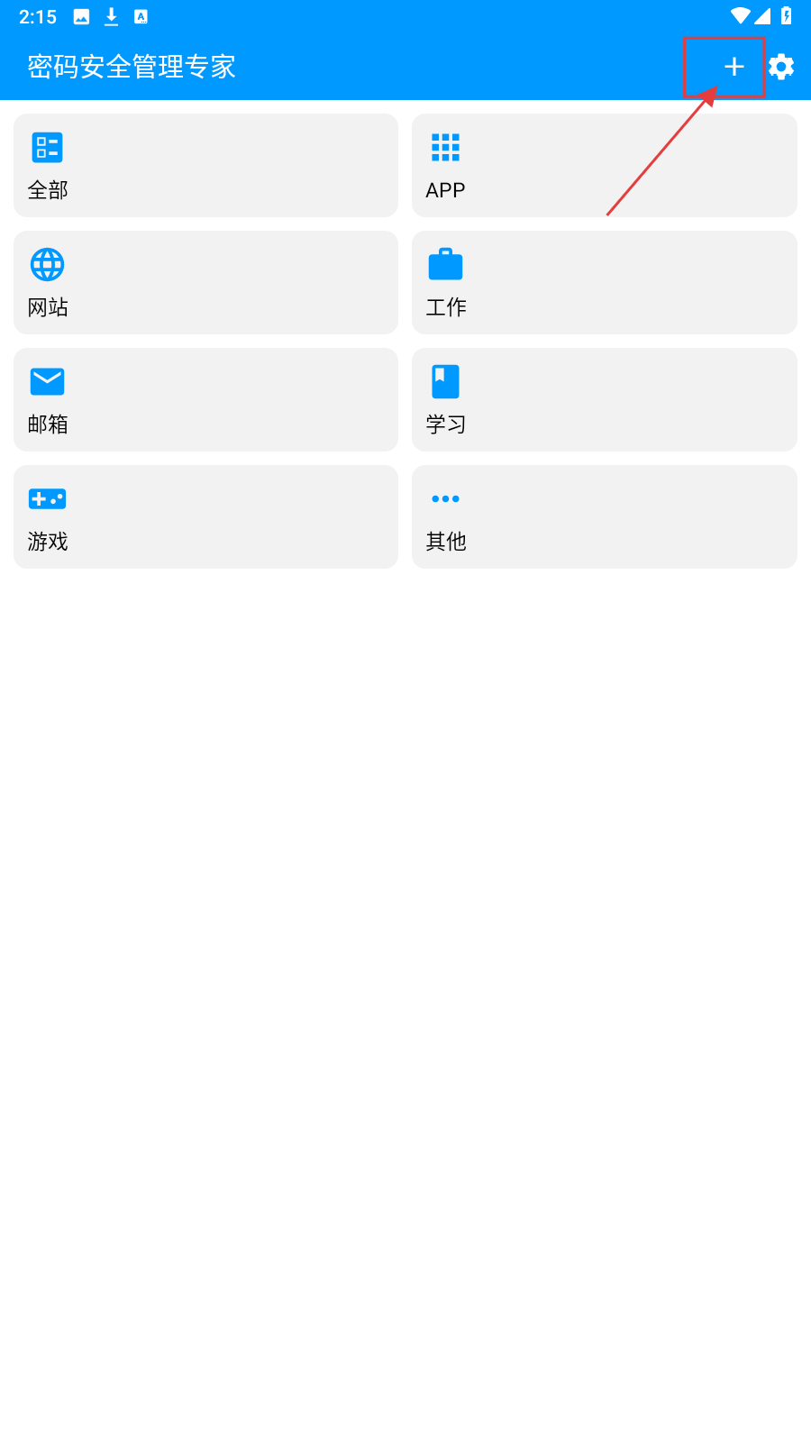 1、打开“密码安全管理专家”APP,点击首页右上角【+】,进入添加页。