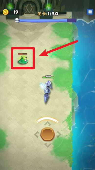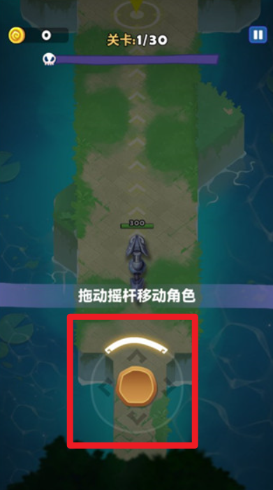 1、游戏开始,在关卡界面,依据“拖动摇杆移动角色”提示,通过操作摇杆控制角色移动,躲避敌人(如绿色怪物)攻击。