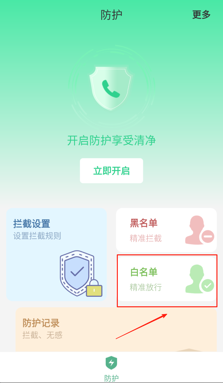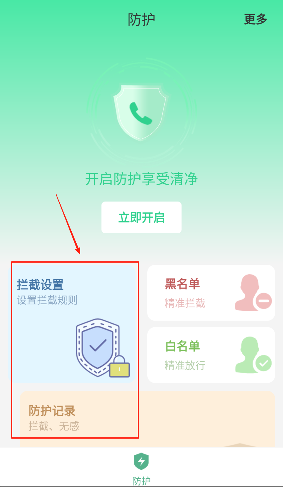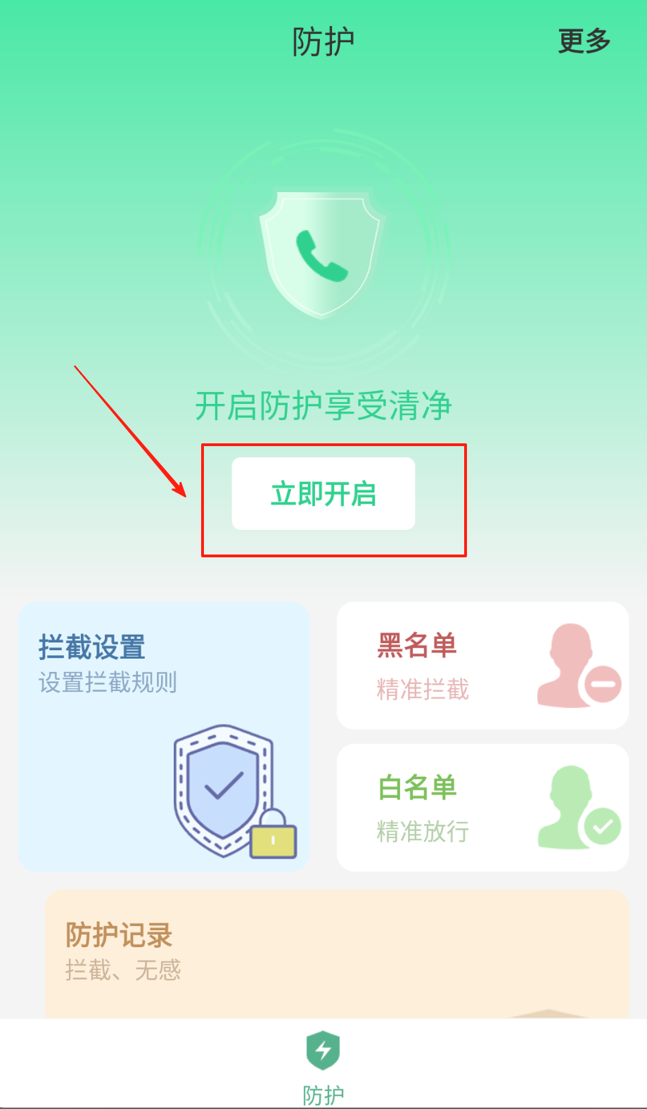 1、首页开启智能防护开关,自动同步云端骚扰号码库,陌生来电实时弹窗显示被标记次数及标签类型,点击即可加入黑名单哦。
