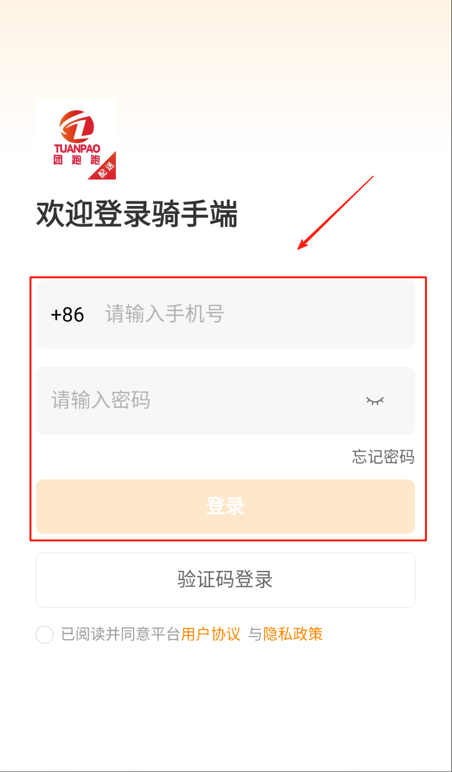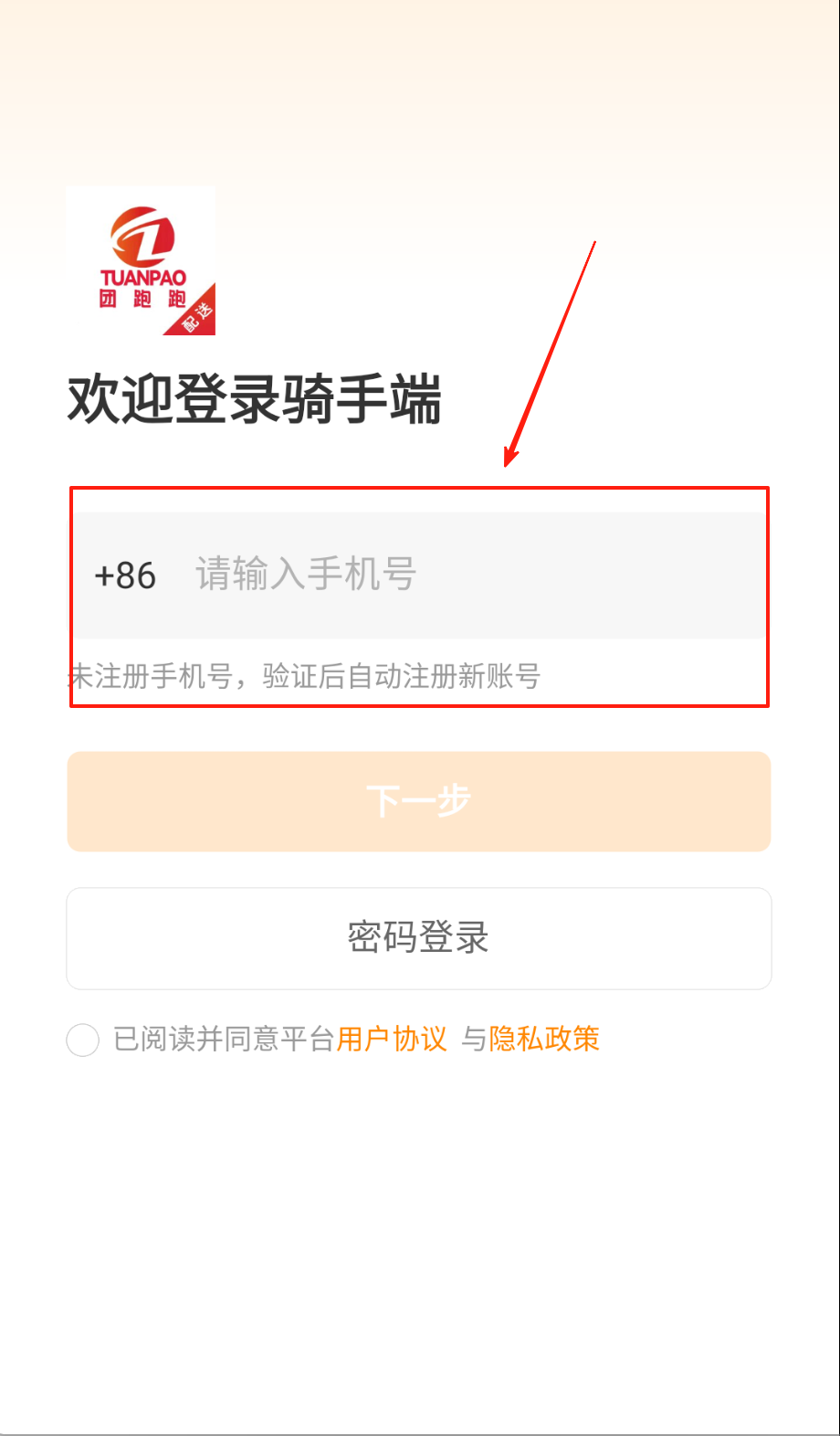 1、打开团跑跑APP见到登录页,输手机号点下一步,没注册过会帮您自动注册好呢。