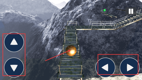 1、游戏开始,熟悉屏幕左右两侧的操作按钮,左侧按钮控制球的转向(左转、右转),右侧按钮控制球的行进(前进、后退)。