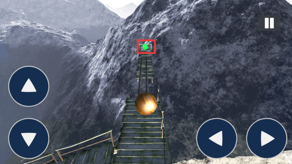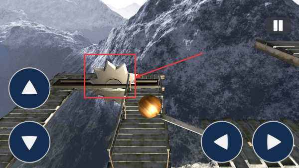 2、在山间栈道场景中,操控球前进时,注意观察前方道路,提前预判并灵活使用转向按钮,躲避像齿轮这样的障碍物,防止球被破坏。