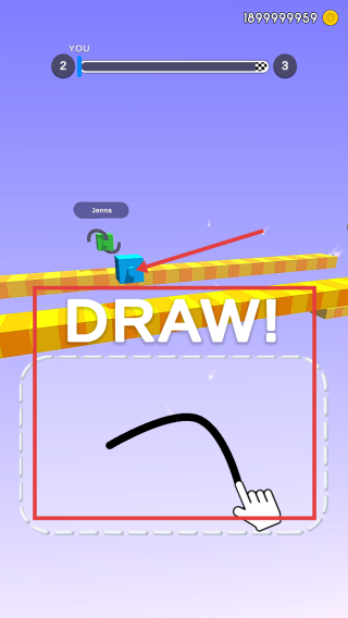 1、游戏开始,看到“DRAW!”提示,在指定区域通过手指绘制线条,为蓝色方块角色创造行进路径或助力道具,帮助其前进。