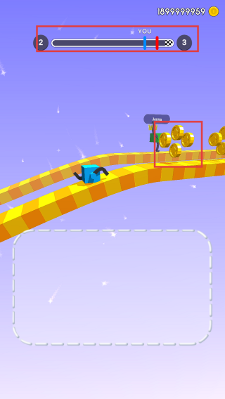 2、关注上方进度条(YOU,2-3),了解与对手Jenna的竞争进度。在赛道上,引导角色收集金币,增加得分和资源。