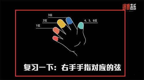 2、吉他学习中,有右手手指对应弦的知识(1弦-小指等),用于复习。