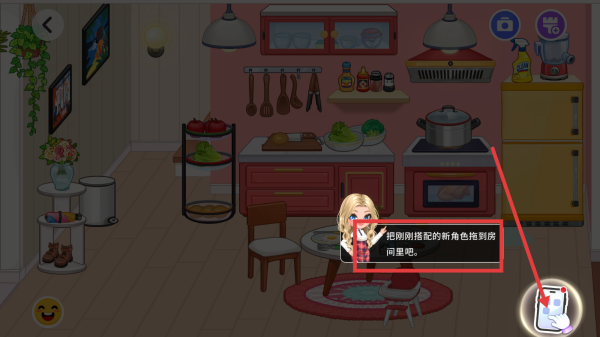 1、游戏开始,按照“把刚刚搭配的新角色拖到房间里”提示,将定制好的角色拖拽至厨房场景中。