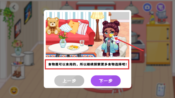 2、在厨房场景里,依据“食物是可以食用的,所以继续探索更多食物选择吧!”提示,点击食物让角色食用,探索不同食物效果。