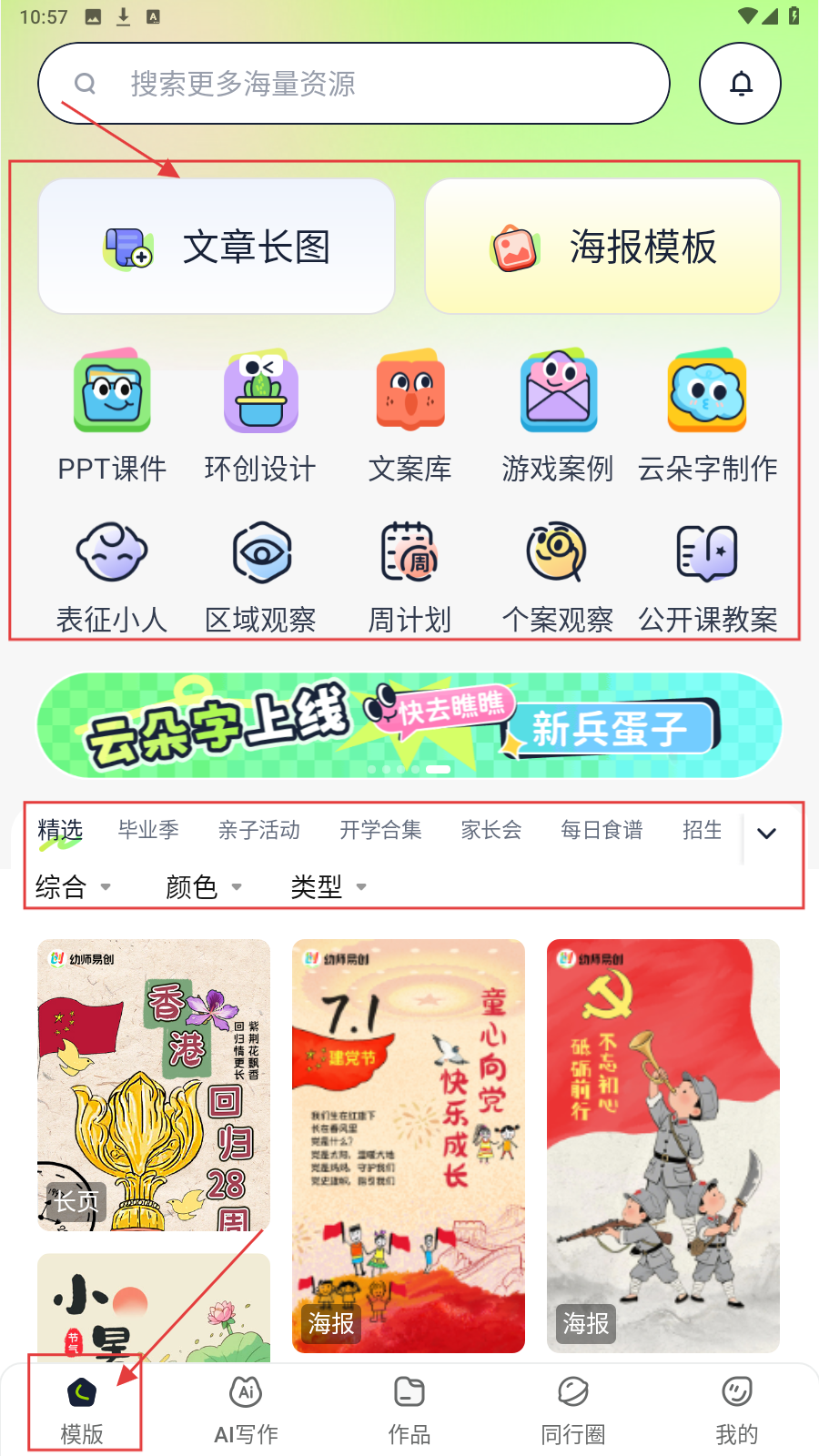 1、进入APP【模版】页,有文章长图、海报模板等功能,及PPT课件、环创设计等资源分类。