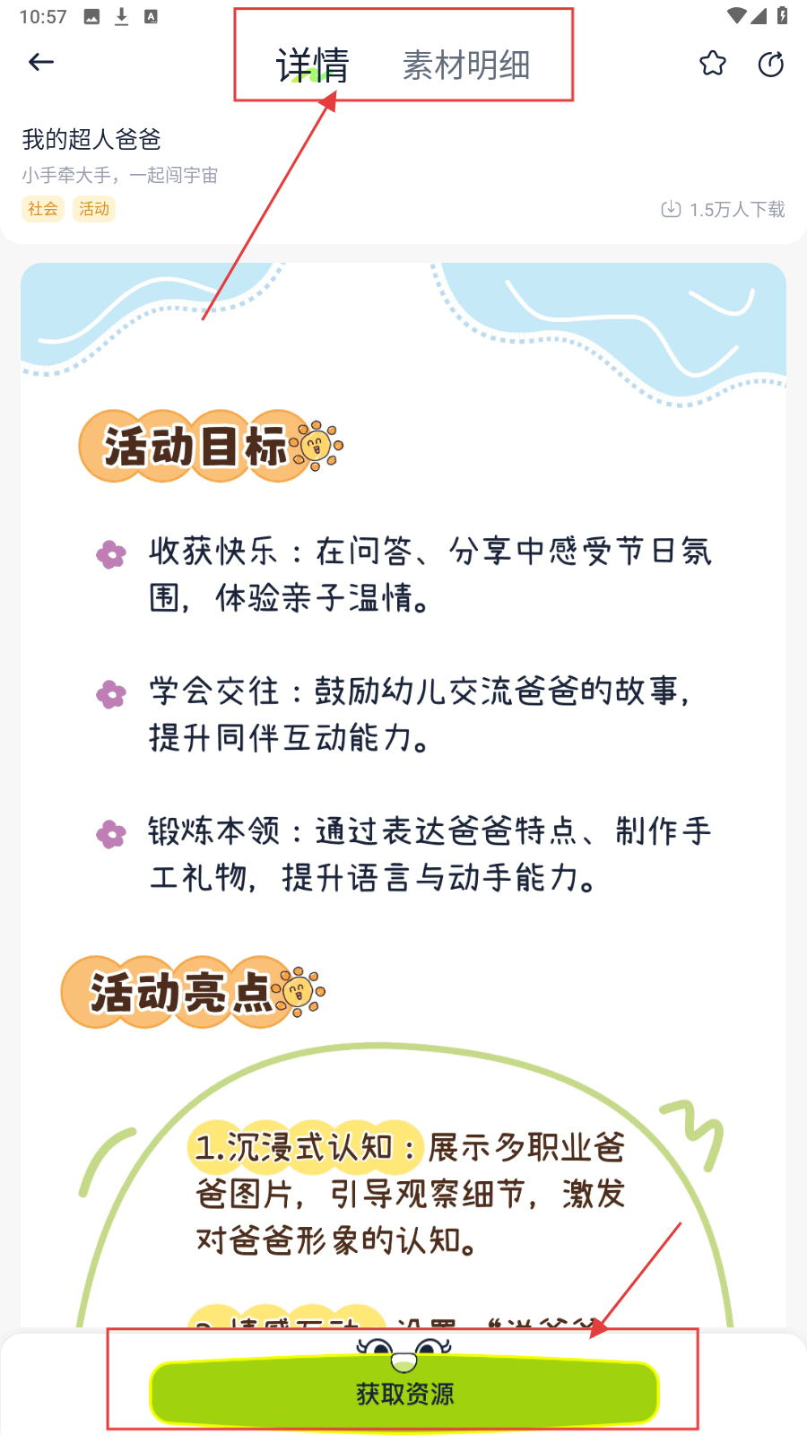3、在课程列表点【我的超人爸爸】,进入详情页,查看活动目标、亮点,点击【获取资源】下载该PPT资源。