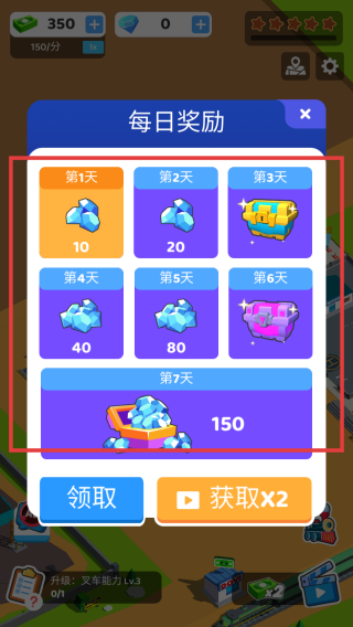 1、游戏开始,每日登录领取“每日奖励”,积累钻石和宝箱等资源,为游戏发展奠基。