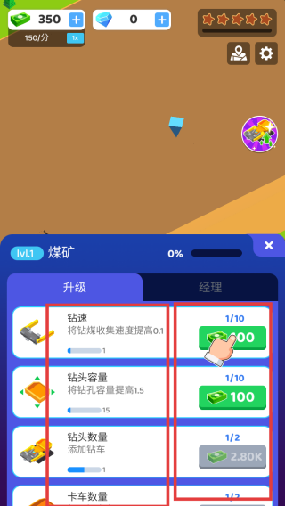 2、进入煤矿界面,依据资金状况和发展需求,优先升级“钻速”提升煤炭收集效率,或升级“钻头容量”增加存储量。