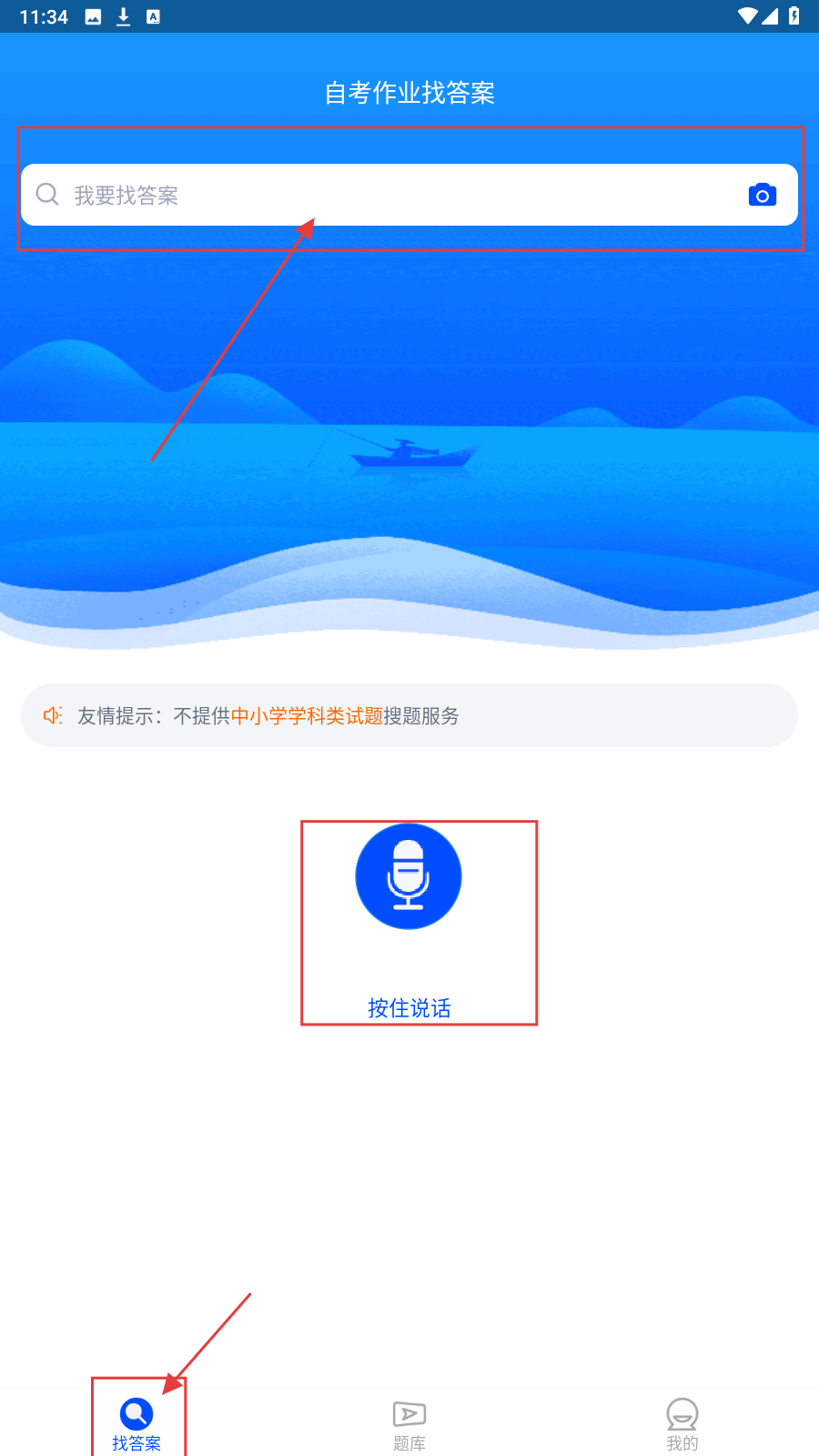 1、打开“自考作业答案”APP,在【找答案】页,可通过搜索框(“我要找答案”)或【按住说话】语音搜题。
