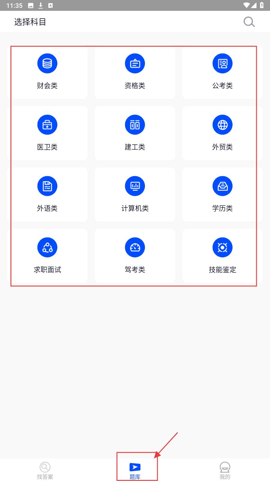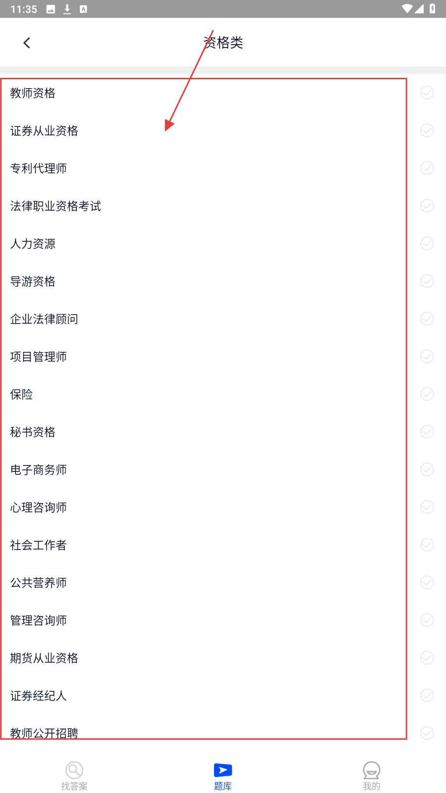 3、进入【资格类】题库,包含教师资格、证券从业资格等考试分类,可按需选择对应考试题库练习。