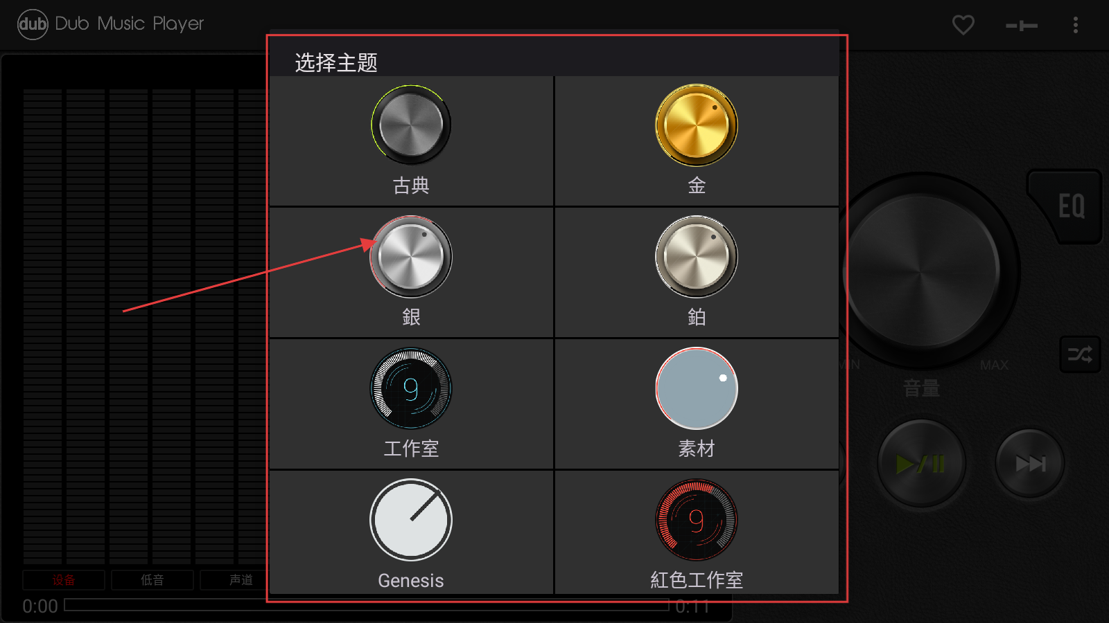 1、打开“Dub音乐播放器”,在主题选择界面,可挑选【古典】【金】【銀】等主题(如选“銀”)。