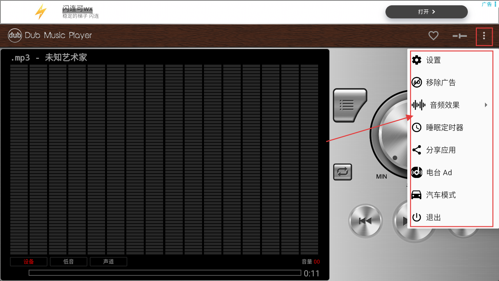 2、点击右上角菜单,能进入【设置】【音频效果】等功能页,按需调整设置。
