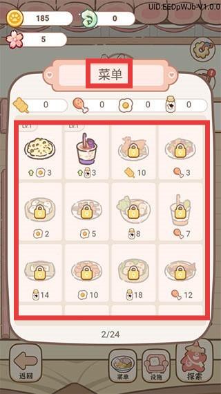2、点击“菜单”,查看菜品,部分菜品需满足一定条件(如金币数量、樱花数量)解锁。优先解锁热门菜品,吸引更多顾客,获取更多收益。