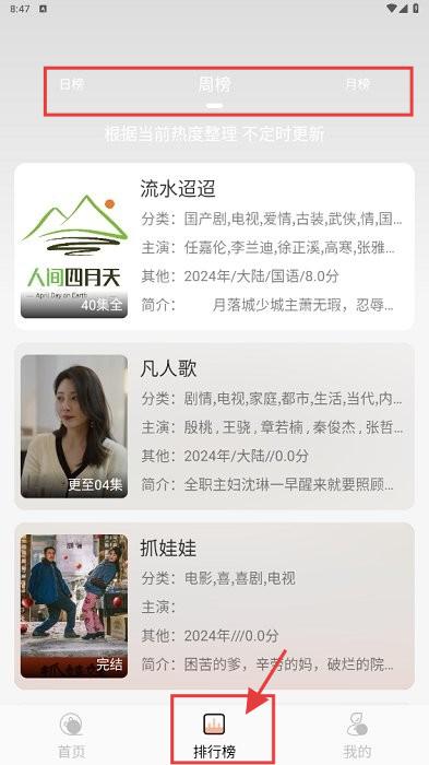 3、点击底部【排行榜】,查看【日榜】【周榜】【月榜】热门影视(如《流水迢迢》《凡人歌》等),浏览详情选片观看。