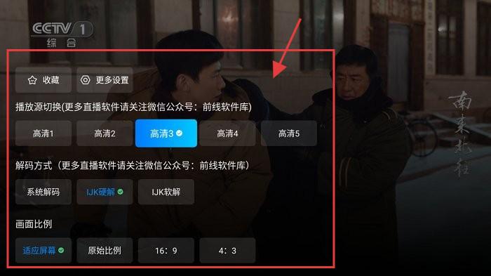 2、在播放设置界面,可切换播放源、解码方式、画面比例,按需调整。