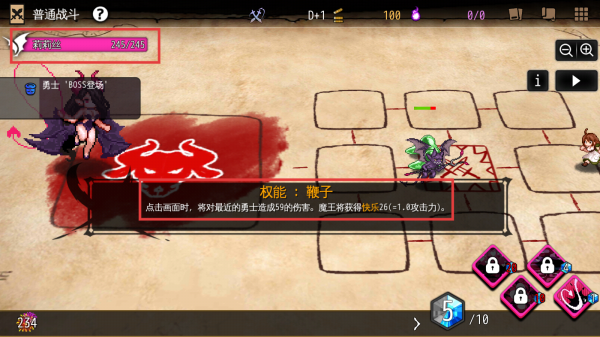 2、进入战斗后,熟悉角色莉莉丝的权能(如鞭子),利用权能机制(点击对勇士造成伤害并获取快乐值)攻击敌人。