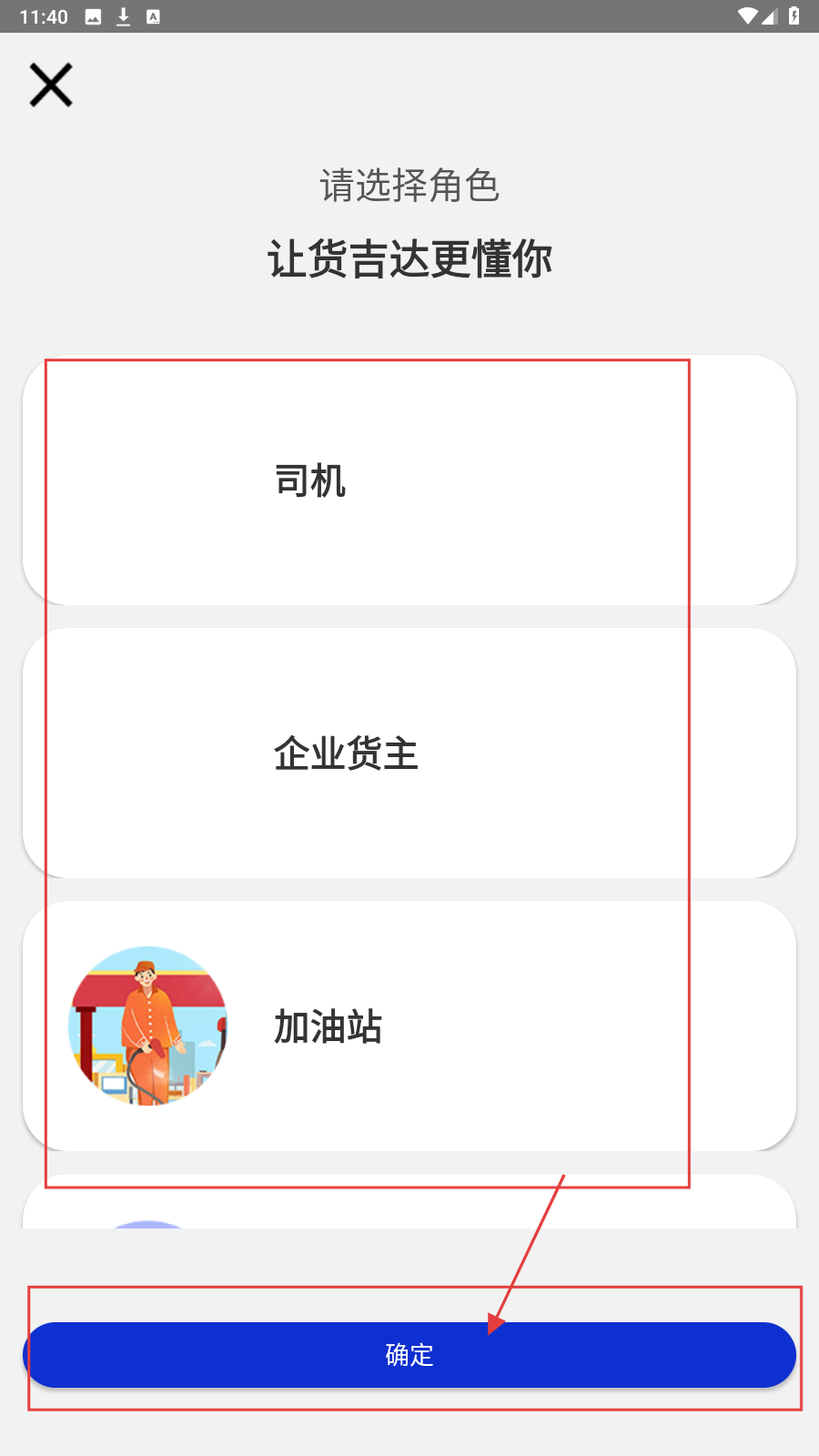 2、按提示选择角色(司机/企业货主/加油站),点【确定】。